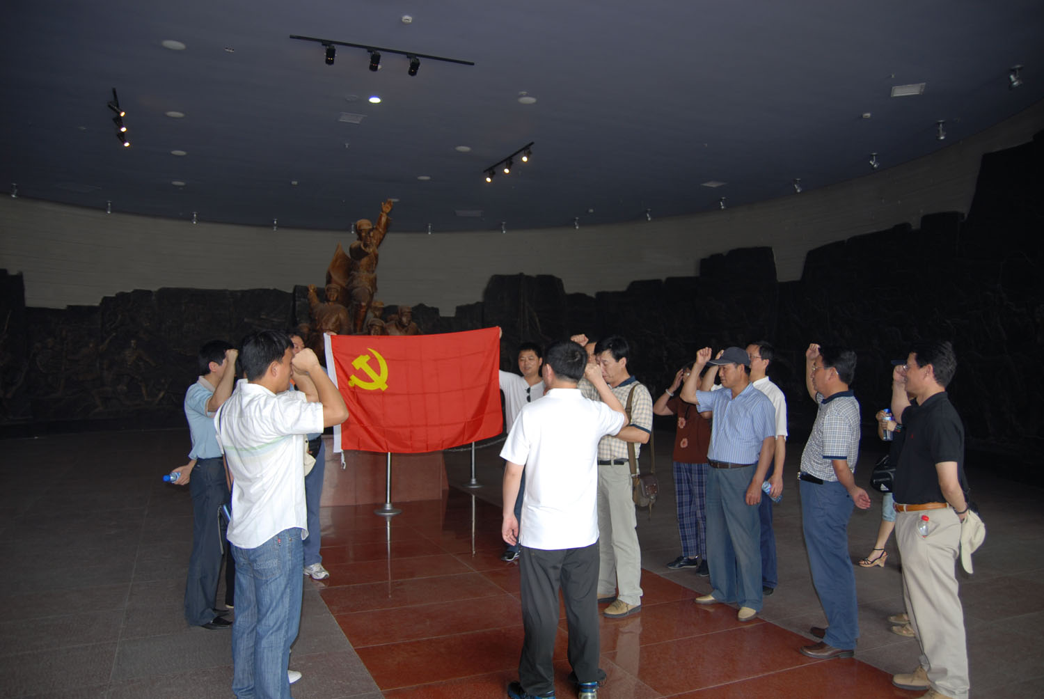 最后在淮海戰(zhàn)役紀(jì)念館前,預(yù)備黨員面隊(duì)著中國共產(chǎn)黨黨旗,緊握右拳,舉起手臂進(jìn)行了莊嚴(yán)的入黨宣誓,老黨員重溫入黨誓詞。不少同志拍下了許多照片來紀(jì)念這次有意義的活動(dòng),最后全體黨員同志在淮海戰(zhàn)役紀(jì)念碑前合影以留念。