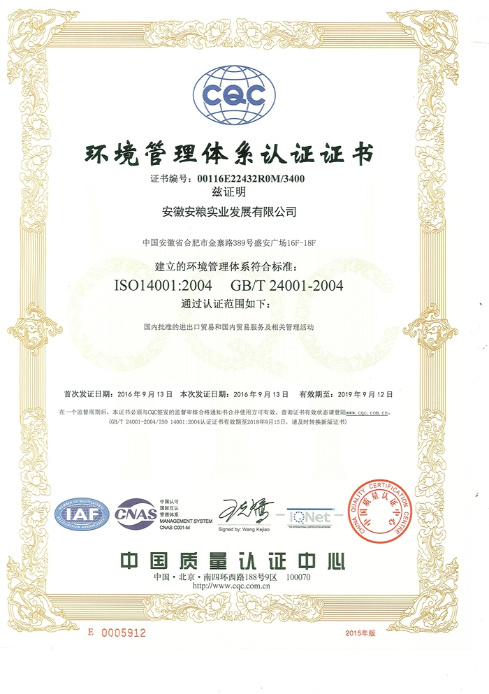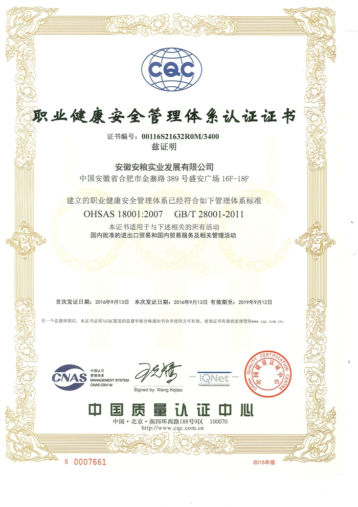 近期,安糧實(shí)業(yè)順利通過中國質(zhì)量認(rèn)證中心審核,在ISO9001認(rèn)證的基礎(chǔ)上又取得了ISO14001環(huán)境管理體系和OHSAS18001職業(yè)健康安全管理體系認(rèn)證證書。證書的獲得標(biāo)志著安糧實(shí)業(yè)建立了完整國際化管理體系,實(shí)現(xiàn)了ISO9001、ISO14001和OHSAS18001三個(gè)體系并行運(yùn)轉(zhuǎn),必將促進(jìn)公司生產(chǎn)經(jīng)營活動(dòng)更上一個(gè)臺(tái)階。