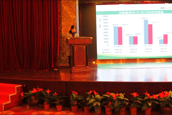 隨后,安糧期貨總經(jīng)理余萍作公司2016年度工作總結報告。余總回顧了2016年全國期貨市場情況,結合公司各項經(jīng)營指標進行深入解讀,對過去一年的重點工作完成情況進行了總結,介紹了2016年公司經(jīng)營成果及榮獲獎項,并分析存在的問題。余總指出,2016年公司取得了良好的經(jīng)營成果,這是全體員工共同努力的結果。新的一年,公司將繼續(xù)奮發(fā)進取,攻堅克難,實現(xiàn)公司跨越式發(fā)展。