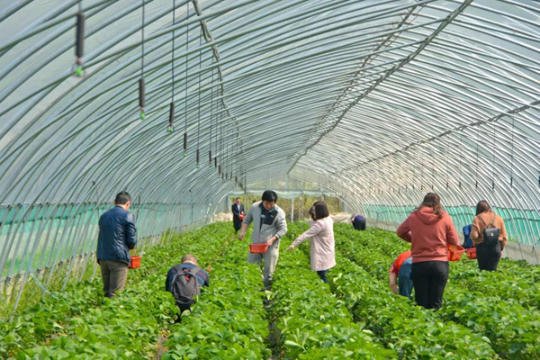 中午,在當?shù)叵愦晦r家樂飽嘗了一頓鄉(xiāng)間美味后,我們乘車前往舒城扶貧產業(yè)園——草莓示范園。成片的大棚映入眼簾,馥郁的草莓甜香撲面而來,繽紛靚麗的身影在田間穿梭忙碌,一個個籃筐里漸漸壘起了小山,品嘗著草莓的甜蜜,滋潤喉間,其樂無窮。下午三時,我們乘坐大巴,踏上歸程。
