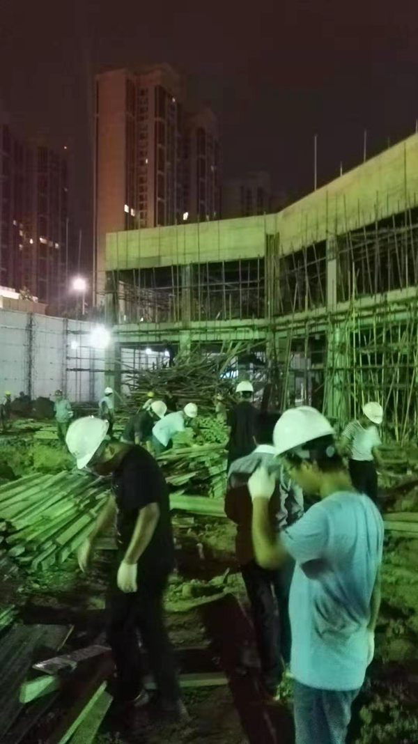 經(jīng)過簡短的會議部署,項(xiàng)目部管理人員即刻動員組織農(nóng)民工加班,楊勇親自和工人們面對面溝通,對工人們曉之以理動之以情。不到11點(diǎn)半,工地現(xiàn)場的工作燈通通亮了起來,鋼筋班組、木工班組、管理人員紛紛投入工作,形成了一組初秋深夜的奏鳴曲。所有管理人員也都在現(xiàn)場陪著工人們一起干,不完成任務(wù)誰都不休息。