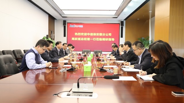 3月3日下午,中信保安徽分公司黨委書記、總經(jīng)理周躍斌帶隊(duì)來公司調(diào)研,曹訓(xùn)立董事長熱情接待了周躍斌總經(jīng)理一行并舉行調(diào)研座談,周洪、吳國杰、朱亮及相關(guān)部門負(fù)責(zé)人參加座談會。