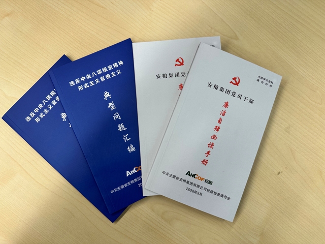 會議還給每位新任職干部發(fā)放了《安糧集團黨員干部廉潔從業(yè)必讀手冊》和《違反中央八項規(guī)定精神形式主義官僚主義典型問題匯編》。