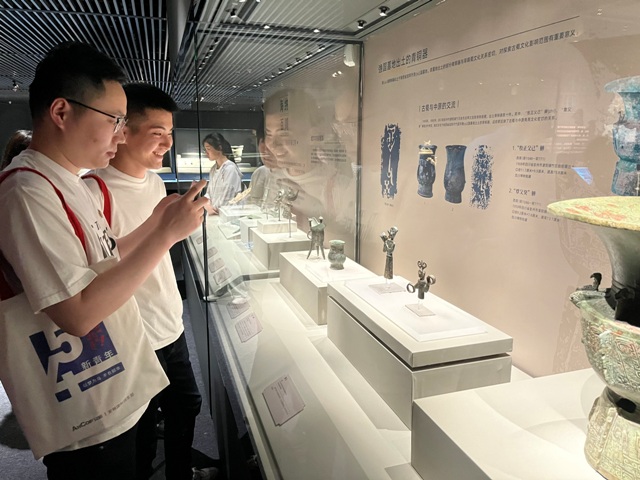 團(tuán)員青年們首先集體參觀了“三星堆?長(zhǎng)江流域青銅文明展”。作為二十世紀(jì)人類最偉大的考古發(fā)現(xiàn)之一,三星堆遺址被譽(yù)為“長(zhǎng)江文明之源”。通過生動(dòng)詳實(shí)的介紹,團(tuán)員們深入了解了黃金面具、青銅人像等三星堆“頂流”文物,領(lǐng)略了長(zhǎng)江流域青銅文明的歷史光輝和璀璨成就。