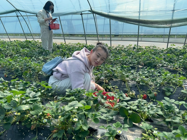 連片的草莓棚里,顆顆草莓飽滿、香甜,透著勃勃生機(jī),甜蜜的香氣撲鼻而來。大家按捺不住興奮的心情,提著小框穿梭在草莓田間精挑細(xì)選,或駐足合影、或互相幫助,不一會(huì)兒,筐子里已是碩果累累,收獲的喜悅溢于言表。采摘的同時(shí),果園負(fù)責(zé)人還為大家介紹了草莓品種、草莓的栽培方法和現(xiàn)代農(nóng)業(yè)發(fā)展?fàn)顩r。